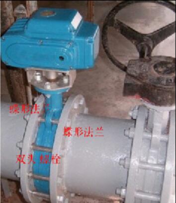 接下來的這個圖片就是對夾蝶閥的一個安裝示意圖。這上面很明白的產(chǎn)品顯示了安裝部分,應該處于的位置。有螺栓也有管道,管子焊在法蘭上,法蘭中間夾著的蝶閥,然后是用雙頭螺栓連接在一起。也有就是使用單頭的六角螺栓來進行安裝的。其實作用也是一樣的。當然這兒說的是對夾式的產(chǎn)品,如果是產(chǎn)品本身自帶法蘭的,是叫做341這樣的一種連接方式,如果看到這樣的一種連接方式,不管他是橡膠密封的或者是金屬硬密封的蝶閥產(chǎn)品。都是配相應的壓力的普通法蘭產(chǎn)品就可以了。圖片中所展示的這個閥門兒叫做電動蝶閥這是說他的驅動方式。有手柄進行。驅動的,也有渦輪驅動的。這個則是遠程的。來操縱它上面的電動裝置來進行打開或者關閉的一種蝶閥產(chǎn)品。這樣的閥門在進行操作時,不用到到現(xiàn)場就行的。電路連接到了閥門上,在控制室里面就能時間閥門的開啟和關閉了。如果和是否采用蝶形法蘭產(chǎn)品在下面的章節(jié)中有說明。